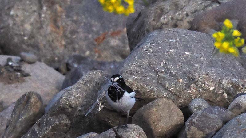 直ぐ傍でセグロセキレイが石の間に巣材を運んでいました。