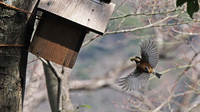 坊主山と塚野山の巣箱には、相次いでヤマガラが苔を運んでいた。