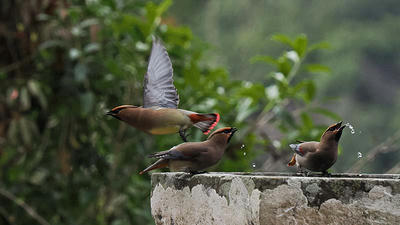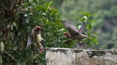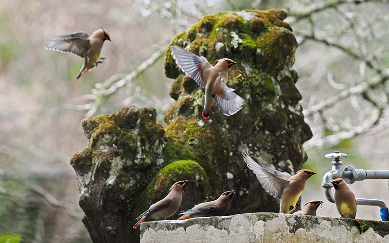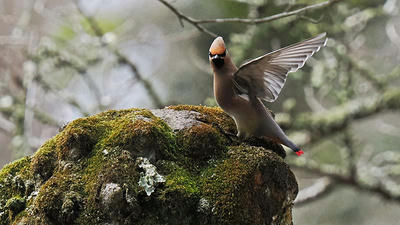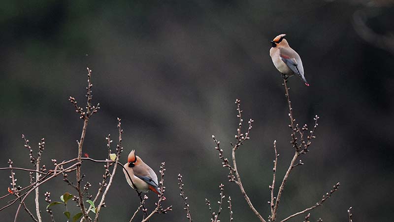 20~30羽位のヒレンジャクに混じってキレンジャクも一羽が混在。