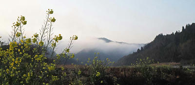 河原には点々と、そして群生などの菜の花が続く