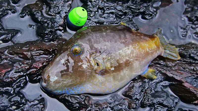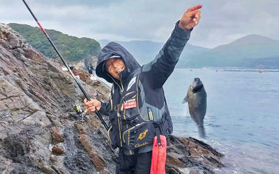 結構なウネリは湾内でも波が膨れ上がりますが、広い磯で足場は自由に選べます。朝の内は小雨がぱらついたり雨粒が落ちない時間帯も有り、午後の本格的な雨が降る前にお土産確保に勤しむ三人でした。