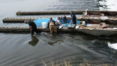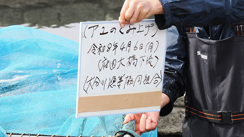 この作業を一日一回数日間行って、車で手分けして運び大分川の本支流に放流する事で、鮎の生存率を高める事でアユ漁に貢献しているのです。