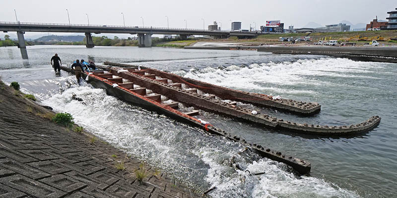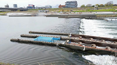 アユの汲み上げ作業は、遡上中の若鮎を堰の魚道の一部を利用して捕獲し、上流へ運んで放流する作業で、発案者の牧さんの声掛けで撮影しました。