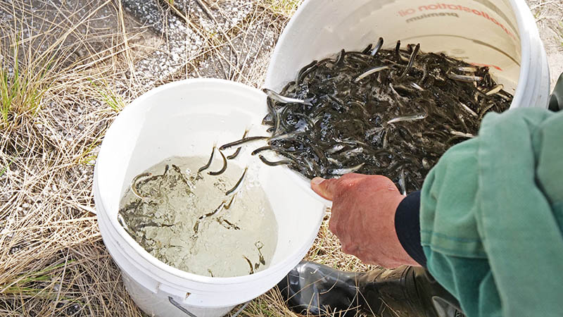 更には遡上を狙ってサギ類を始めとした待ち伏せ漁や、群れで追い込み漁を得意とするカワウなど、人工的な障害と天敵障害など行く手は困難を極めます。