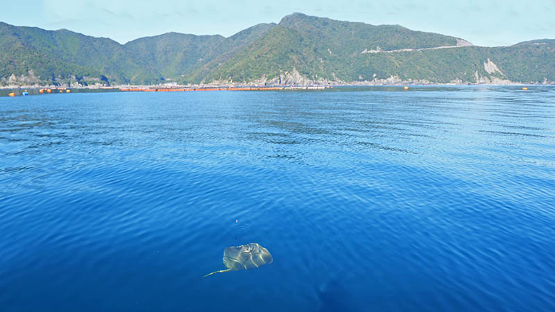 残念ながら湾内生簀は小型マダイのみ、深場の沖の生簀へと移動です。