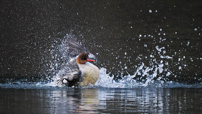 その写真が2枚目から4枚目の写真ですが、この状況から♂が♀にエサを渡すのは水中から渡していると推測しました。これなら、他の鳥に横取りされない。アイサ類が魚を食べる時、決して上を向かないで嘴を水面で付近で食べる事(横取り防止)を考えると、水中からのエサ渡しも納得がいきます。