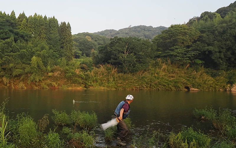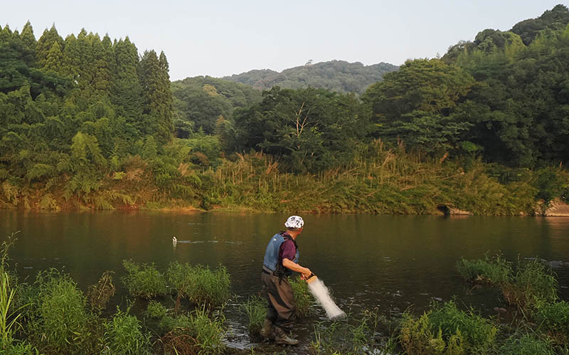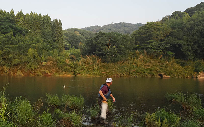 挨拶を交わすと、その方は漁の準備を始めた。なんと小型の縦網を持ったので小鷹網漁?との思いで見ていると、パッと投げて引き上げると鮎が数匹。