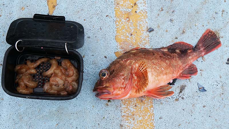 次は0.8号オモリで差し込むけど、やはりほぼ真下に落ちてアタリ無し。次は5Bのガン玉。少し流れる程度でこれにもアタリ無し。エサをカラスガイからムキミに変えて落とす事数投、良型のカサゴが釣れましたが、大型魚のアタリ無し。