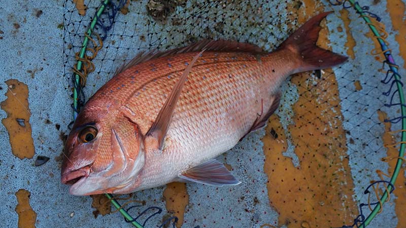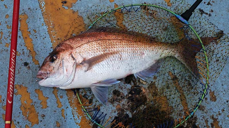 石鯛釣りを止め、40mラインのフカセ釣り。マキエを広めに打ち、時間差で仕掛けを投入します。道糸はPE1.5号、ハリス4号に伊勢アマ12号。ガン玉は2Bでムキミを差し込むと、2投目でキロ弱の真鯛、3投目で3キロ弱のマダイです。