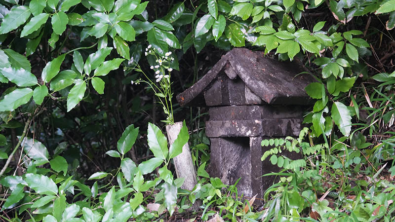 県民の森、ヤマガラハウスでまったりして、後方のカーブにある祠が地震か何かで倒れていたのを修復、苔などを払って水が無かったからお茶で清めた。