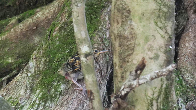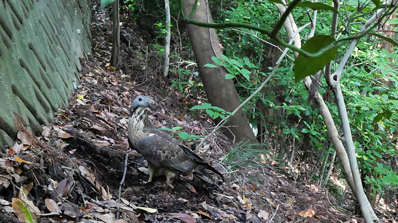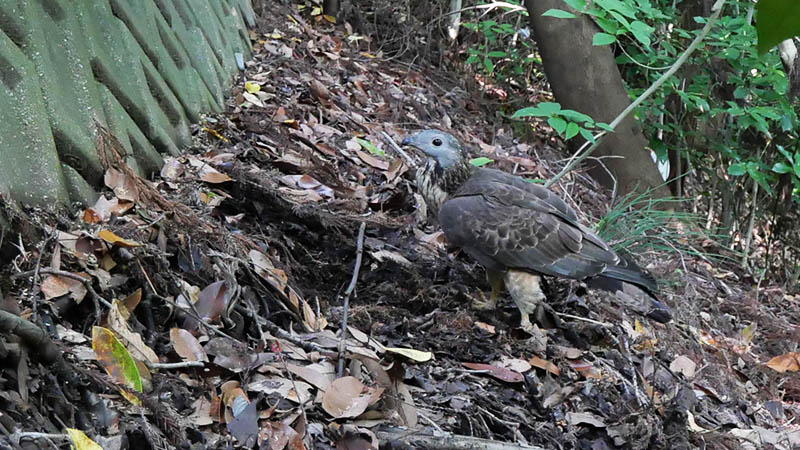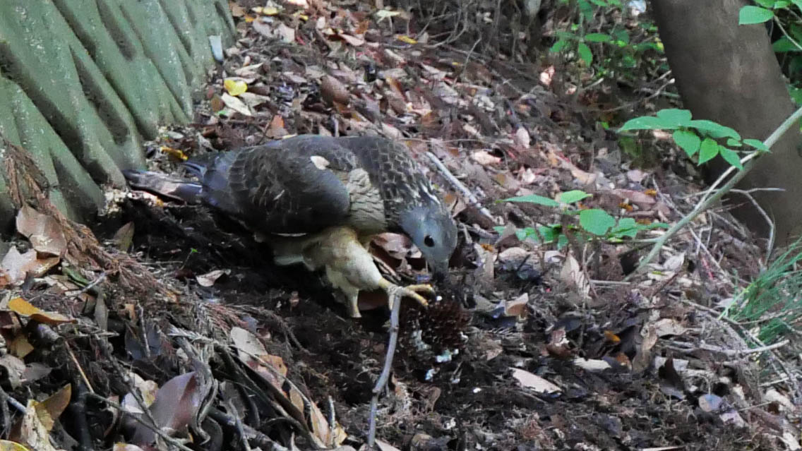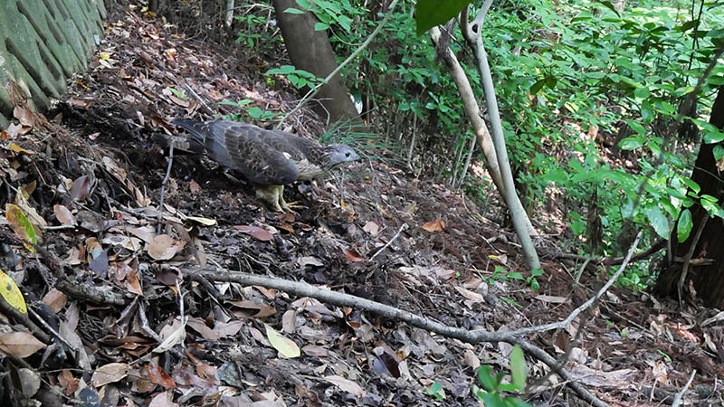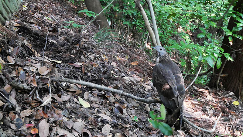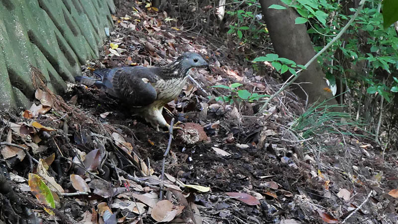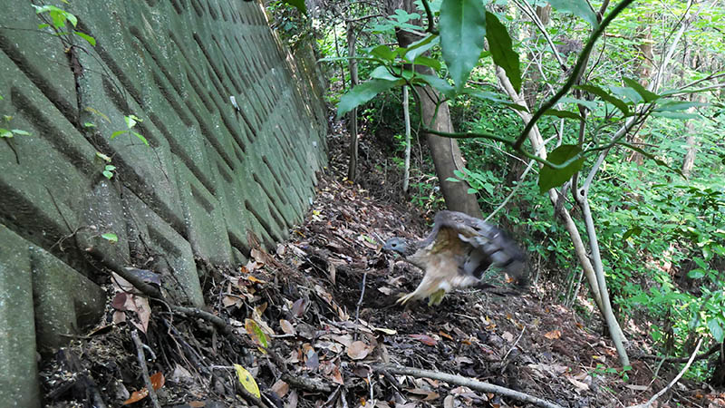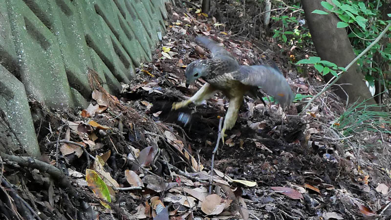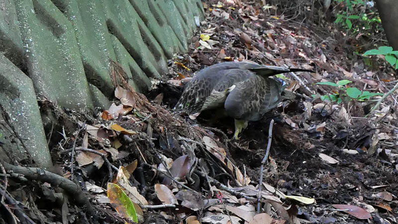 その後、サンコウチョウの場所へ移動。小鳥たちが少し騒がしかったのでガードレール迄行くと大きな鳥が樹間に消えて行った。飛び立った場所を見ると堆積した落ち葉が搔き分けられ、キイロスズメバチと思われる蜂が5~6匹舞っている。