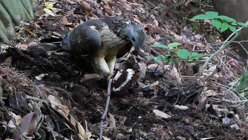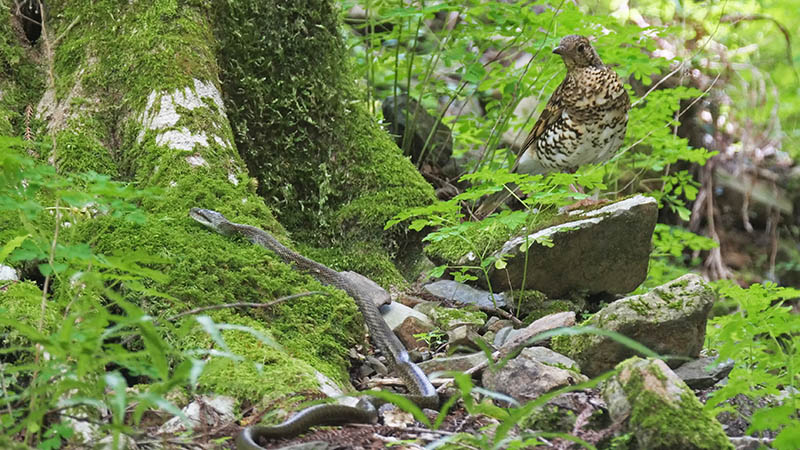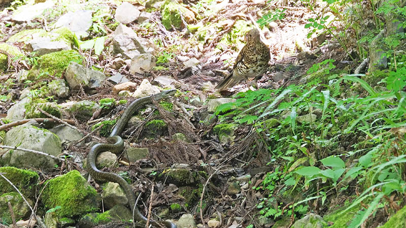 アオダイショウが出現。トラツグミはこのヘビが気になっていたのです。