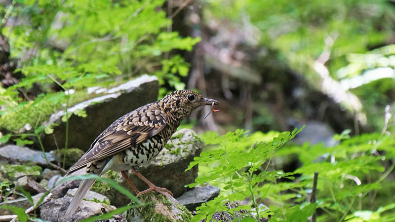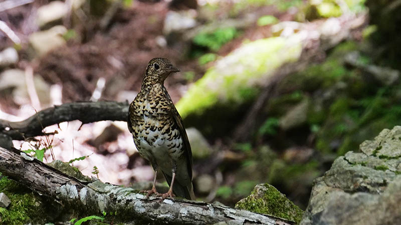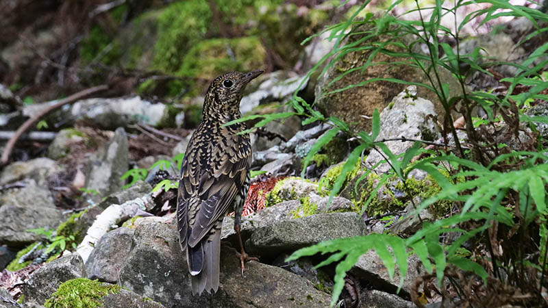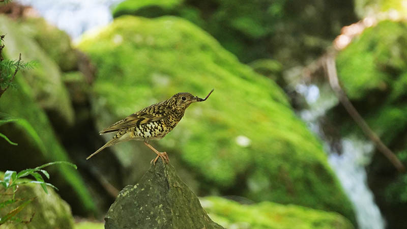 小さな湧水が流れ、渓流に合流するガレ場のトラツグミ