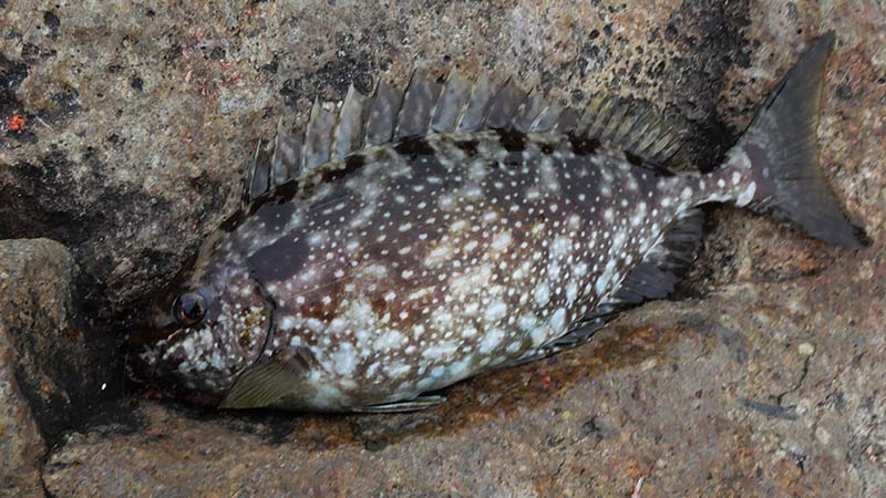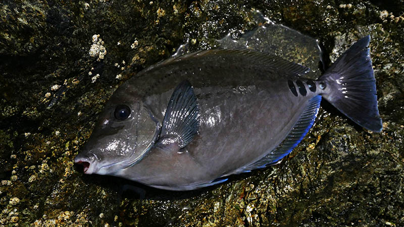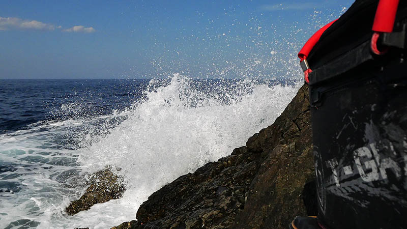 最干潮を過ぎるとウネリは大きくなり、道糸が大サラシに取られることもしばしば。16時の納竿まで潮の状況はほとんど変わらず、ウネリは次第に大きくなったので少し早めの納竿、今回のイサキ狙いは不発で終了です。