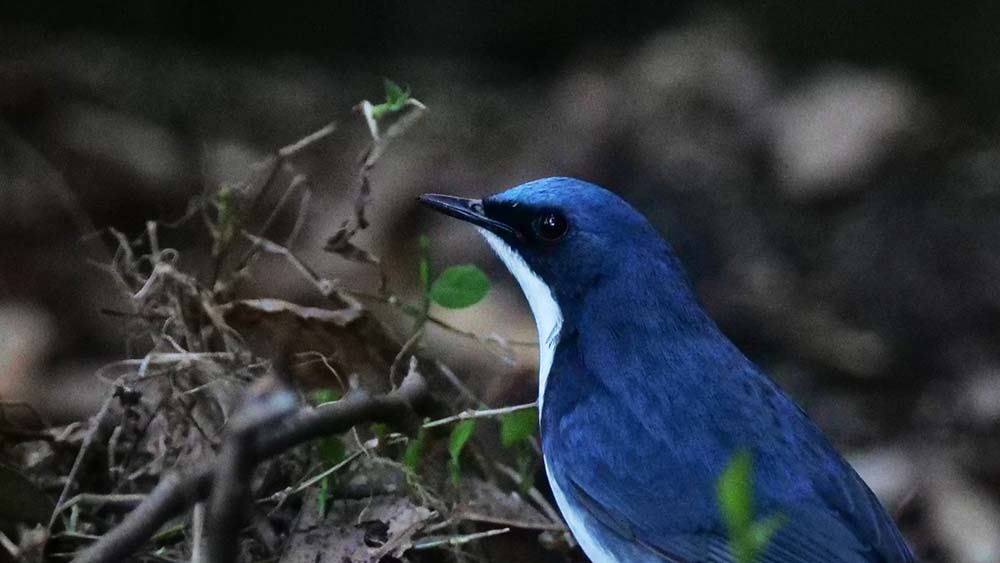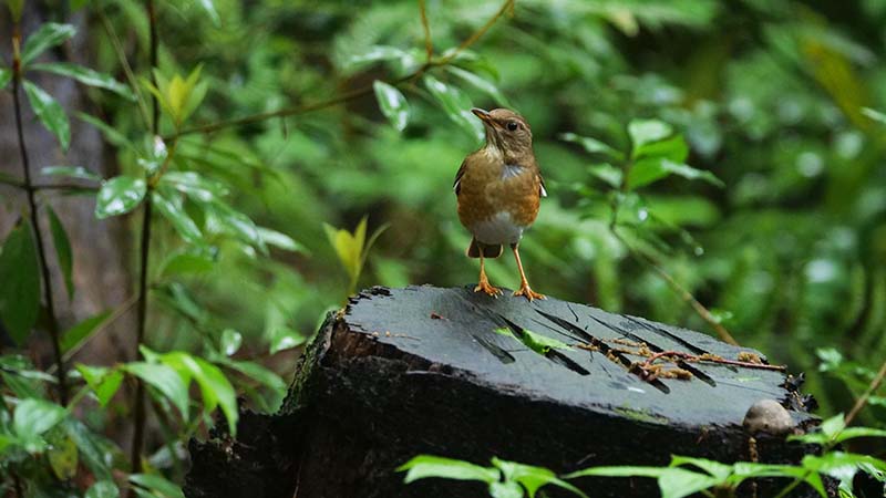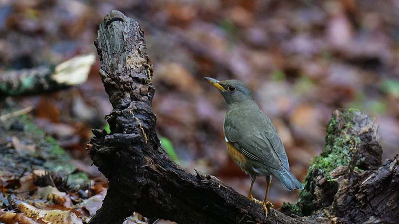 更に待っていると奥からピョンピョン跳ねて、クロジの餌場付近を一周。途中地面の虫を捕って右奥へと斜面を登りそこから飛び立った。