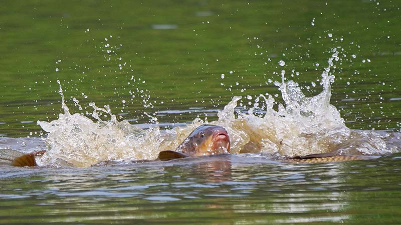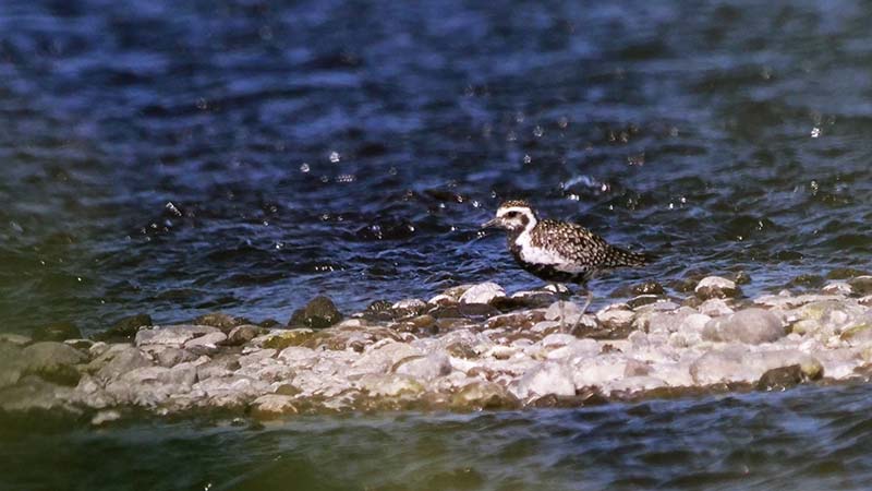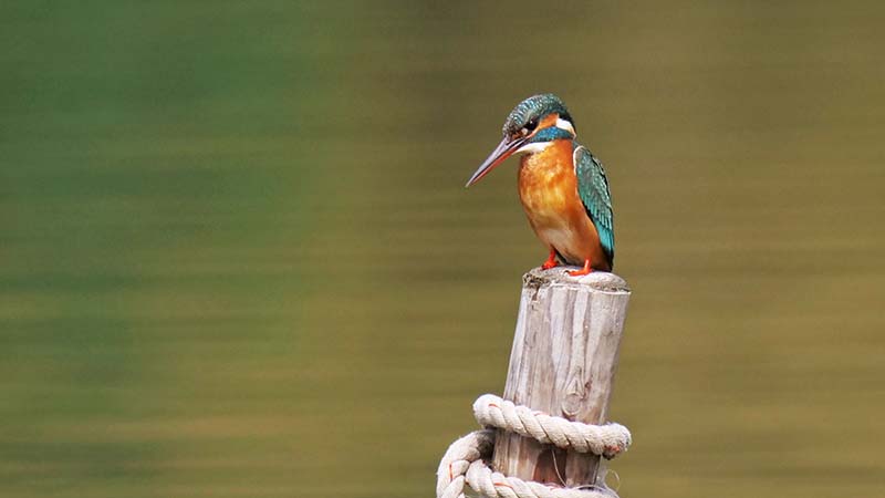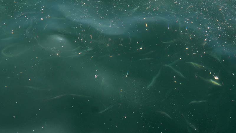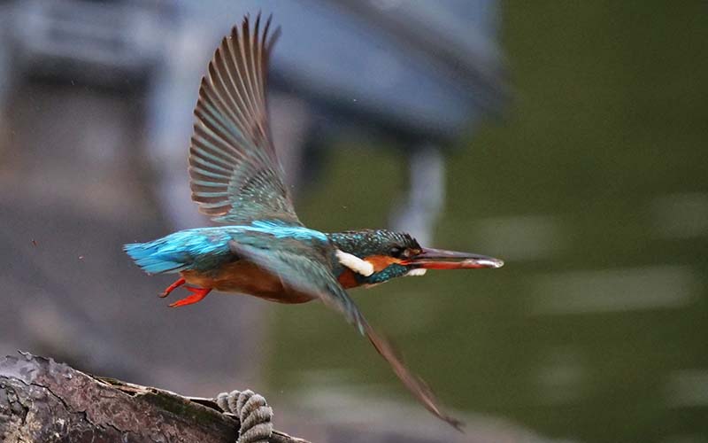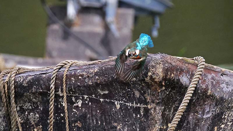 舟を行き来しながら獲物を探し、小さな魚を狙っている。