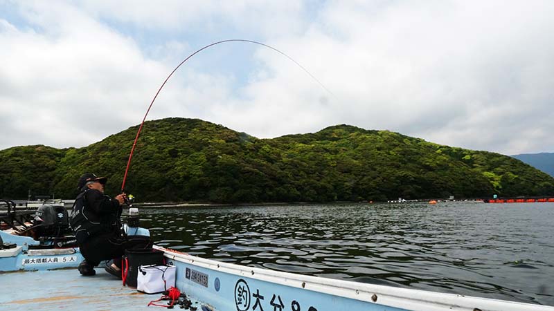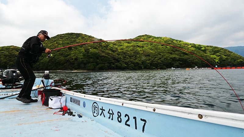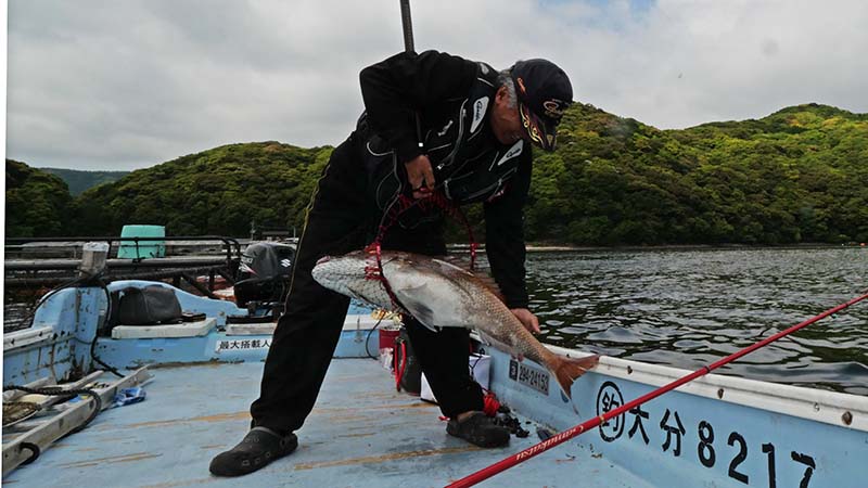 重量とスピードでマダイと直感。糸を出すと生簀の下には潜らず、50m先の生簀方向へと進む残念なマダイ。これで余裕のやり取りをして数分後に海面へ。