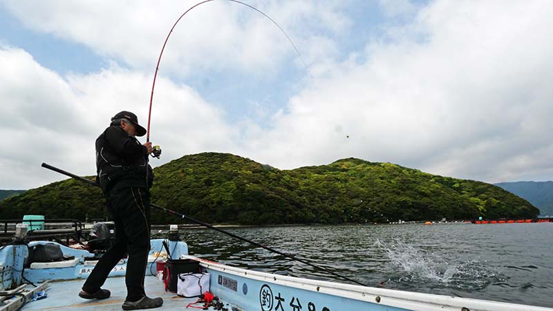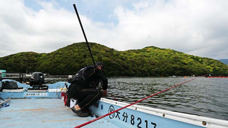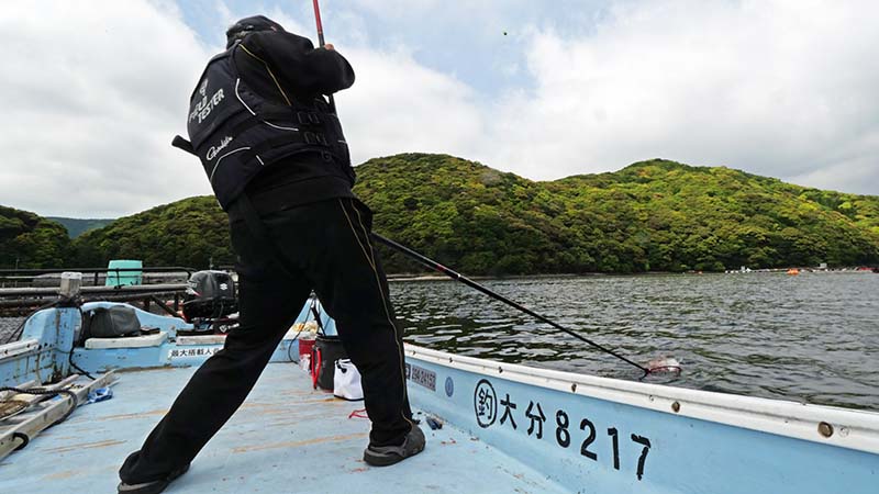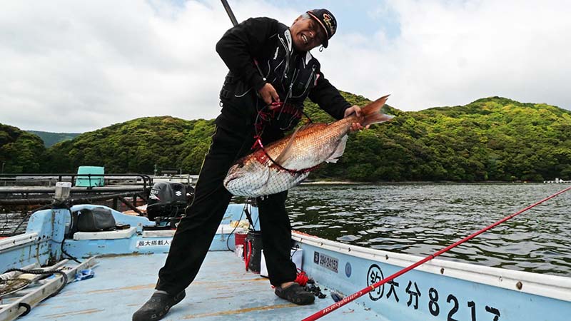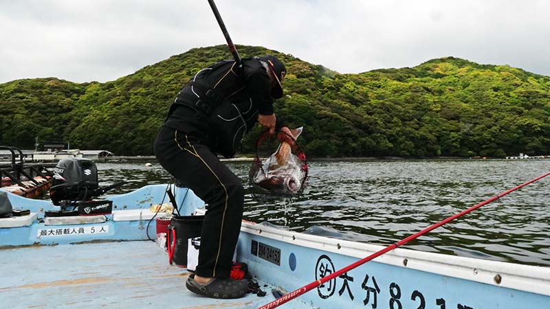 丸二水産の伝馬船で、西野浦の湾内でいつもの生簀からマダイ狙い。