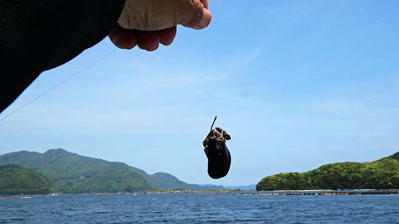 少し大きめのカラスガイを足で少し潰し、割れて身が覗いたカラスガイに鈎を刺し、撒いたカラスガイの後を追うように落とし込んでいく。