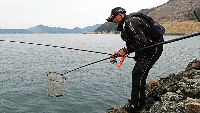 それは延岡の橋本名人と同じく、釣っている最中に一時間おきを目安に、足元に落ちたマキエを洗い流す作業でした。これらは同期で、がまかつテスターの城本君といつも一緒に竿を出している事で、身に着いた作業と思われる。