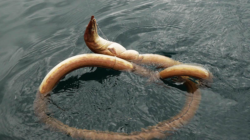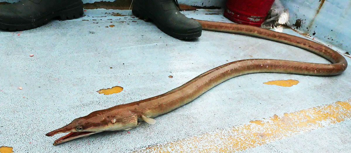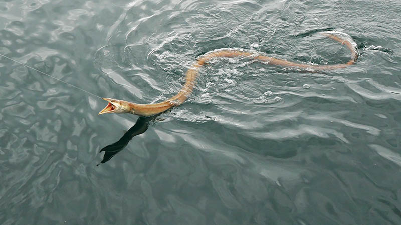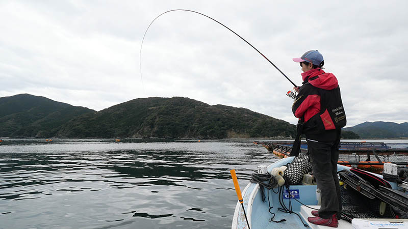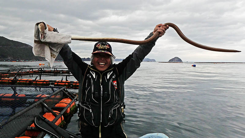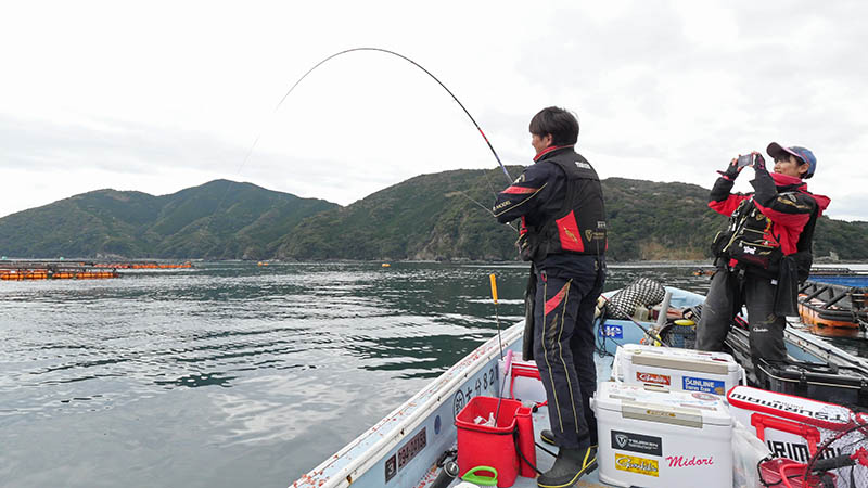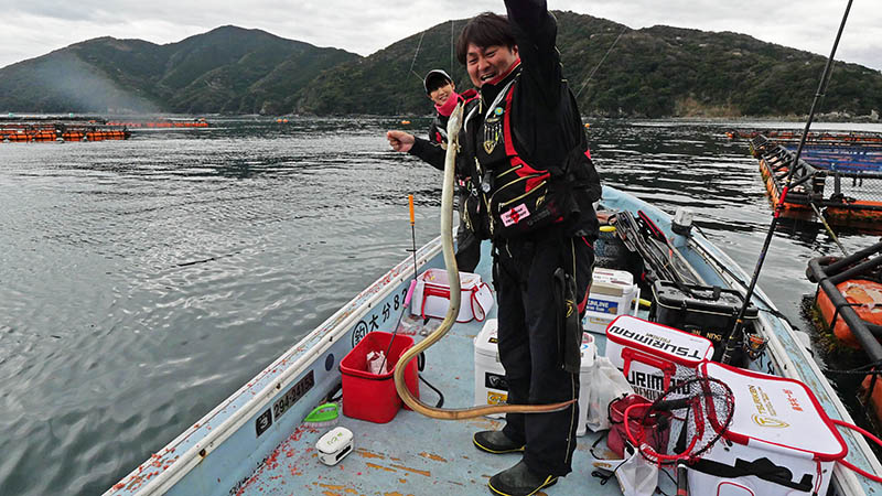 二人ともこの釣りを体験すべく、仕掛けを変えて挑むとメーター超えが連発。掛けた後はくねくねとバックする引きが強烈で面白い。