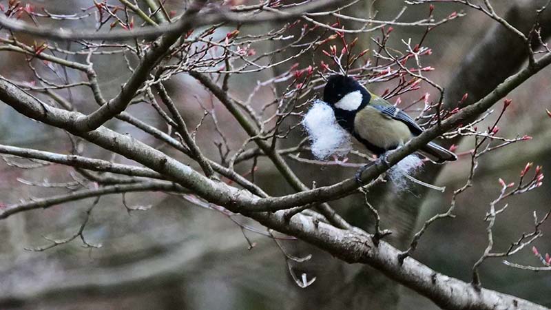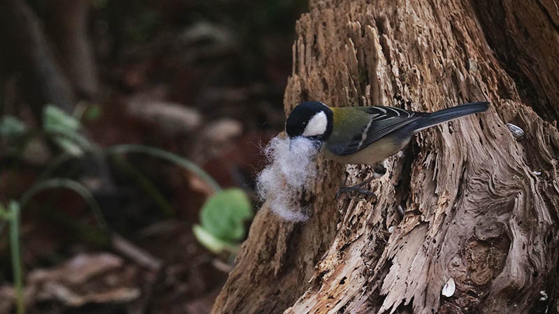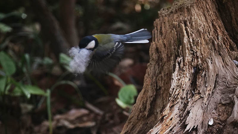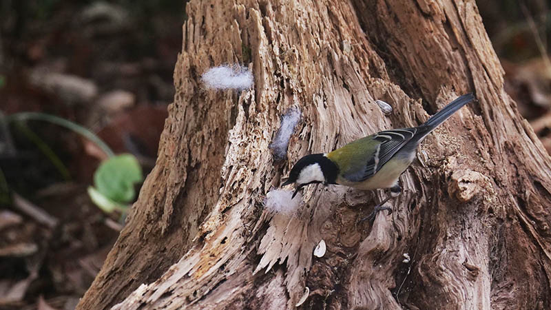 その後、手芸用の綿を小さく切って枯れた株に置いたら、♀が直ぐに見つけて運び出しました。巣材の中で一番柔らかい羽毛と勘違いして運ぶのです。