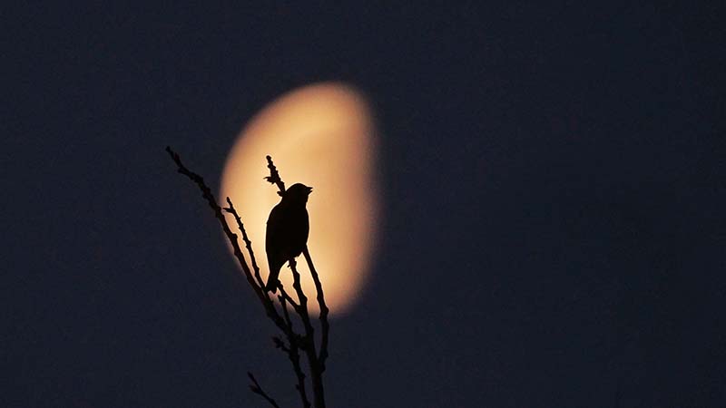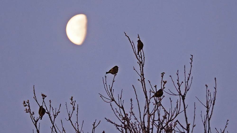 日の出前の月とカワラヒワ