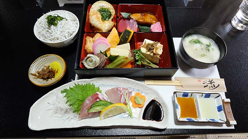 民宿戸高のランチは1500円。ご飯は4種類から選ぶのでシラスご飯にした