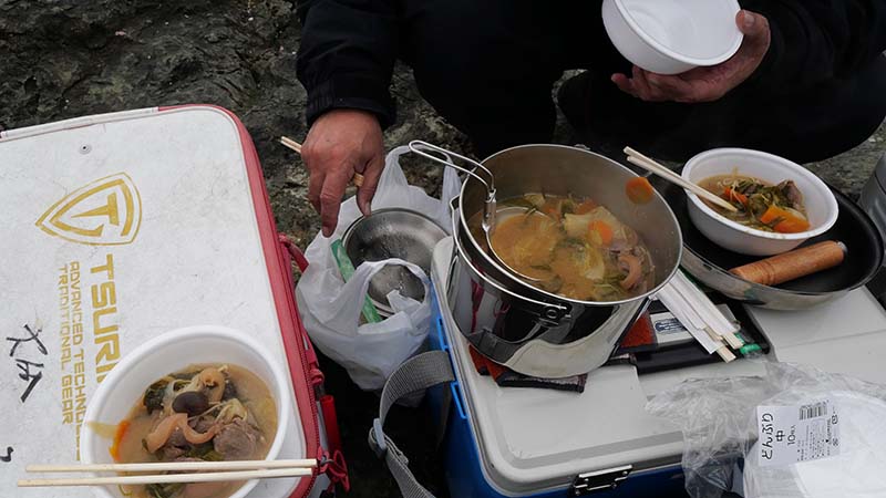 釣り座は、船付き場2名・二番向き1名・裏側のポイント1名で、一時間交代で釣っています。私は唯一空いていた、裏の二番向きのポイントに入って、4人の交代に邪魔にならない当て潮ポイントでクロを狙うことにしました。