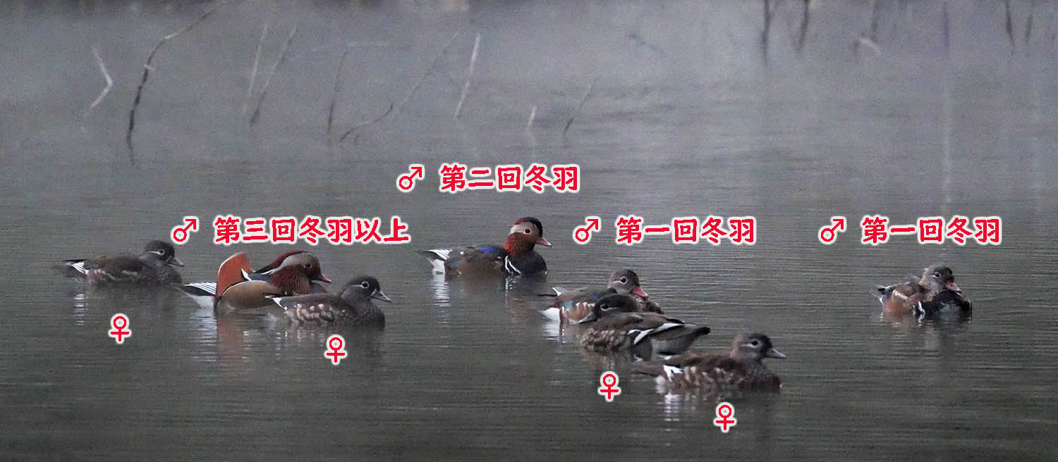 次に一年を越した個体は8~9月に換羽、10月には第二回冬羽の個体が出揃い、翌年の4月には第二回夏羽、その年の10月には第三回冬羽に・・。