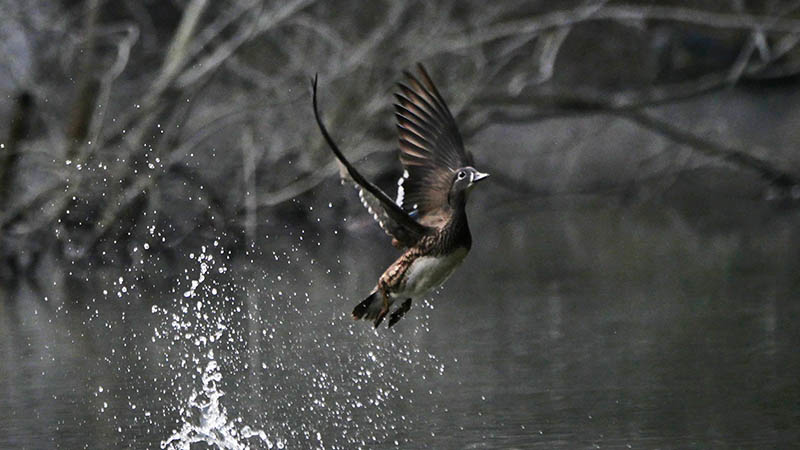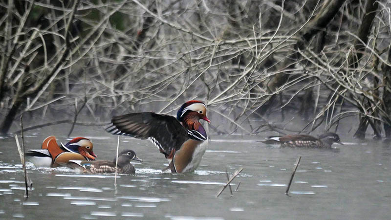 慌ててテントに逃げ込んだのが5時48分。大分は6時25分の日の出だから、約40分前の暗い時間帯ですが、オシドリが採餌から休憩場所に戻って来たのです。