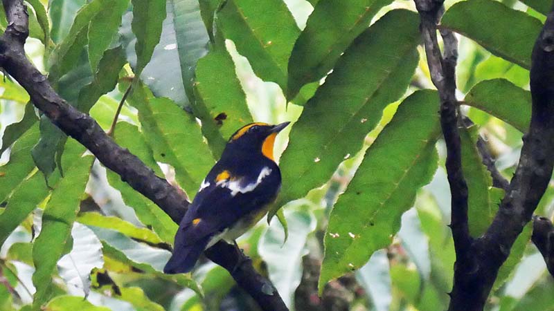 今回はキビタキの♂若と思われる個体に出会いました。一見すると♀にも見えますが、これまでの経験上、翼に白い斑紋が出ているのが♂若の決め手。空抜けで見難いですが頭も翼も少し黒っぽく、♂の特徴が出ていると判断しました。前からでも胸あたりまで色合いが濃くて、将来黄色になる様相を見せています。