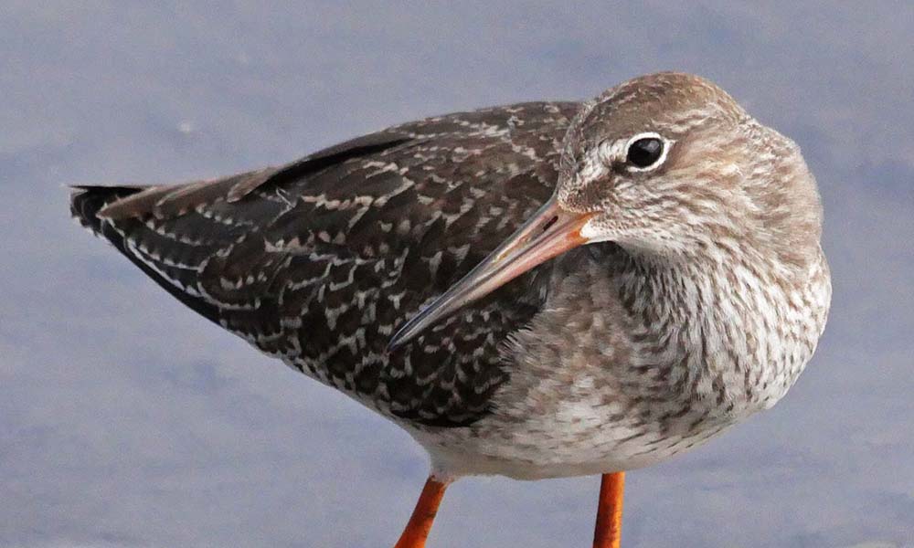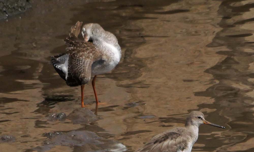 アカアシシギの羽繕い、手前はソリハシシギ