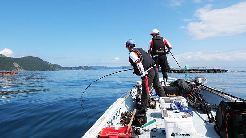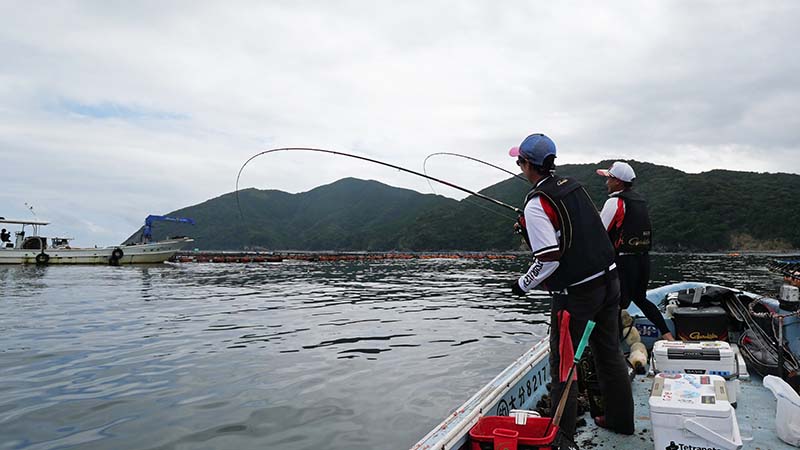 湾内のシマアジ(30㎝級)の養殖生簀に繋いでマダイ狙い