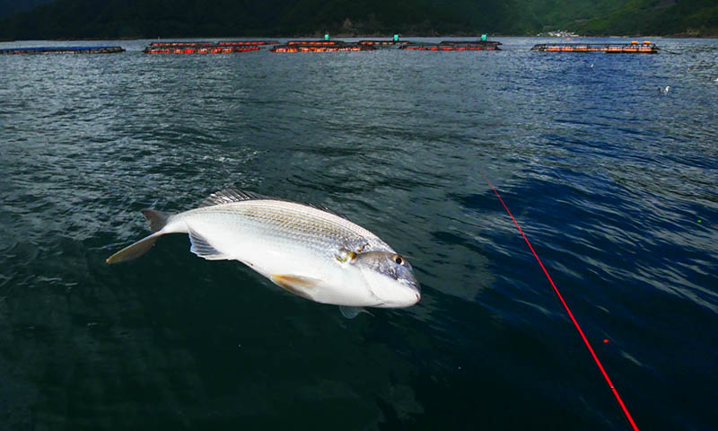 水深13~15mラインの生簀はいつものヘダイが多く、30㎝位のマダイの仔が3枚だけ。35mラインの沖側生簀を繋いでいるブイに船を掛けると、小潮の曲に潮がめちゃ速い。3Bのガン玉3個打ちでも仕掛けの角度を保てず早々に諦め。