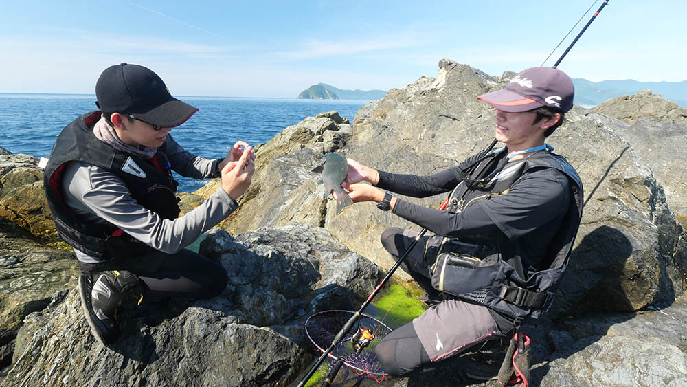 そんな中から、クロとしては自己記録の40㎝オーバーを仕留めた中村君は嬉しそう。今年の一年生でフカセ釣りもこなす北岡君もイスズミの強引な引きにバラシが数回、潮の良い時には良型オナガも混じっていたかもしれませんね。