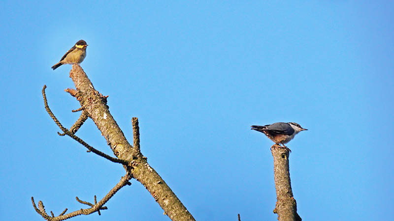 同じ枯れ松の最上部と少し下の枝、ホトトギスは比べると小さい。