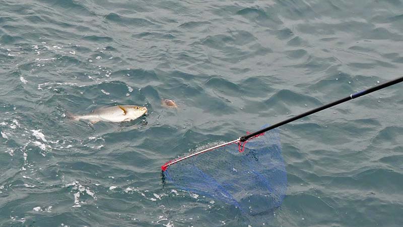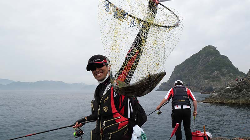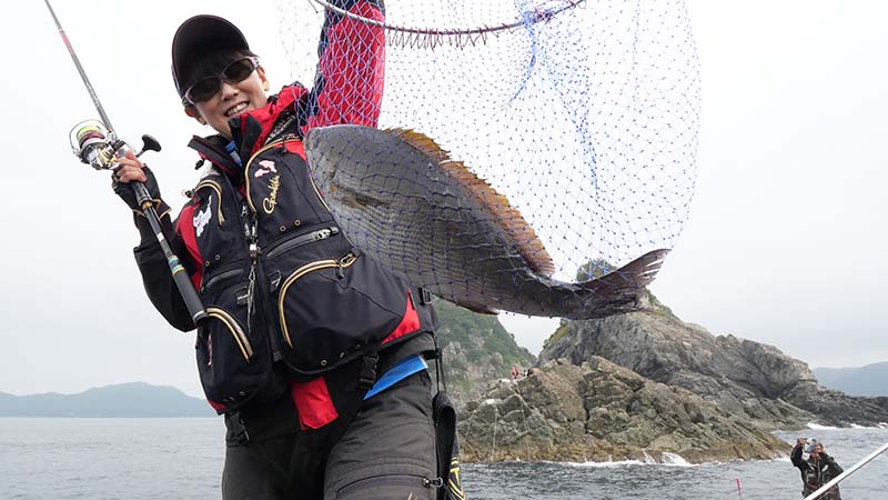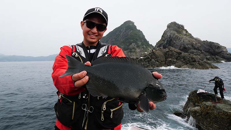 かなりの引きを見せてタモに納まる魚体は大きなイサキ。