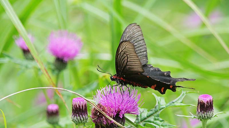 ジャコウアゲハ、2羽のセグロカッコウが鳴く場所で数頭