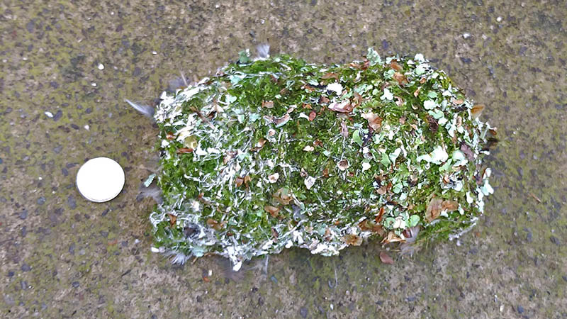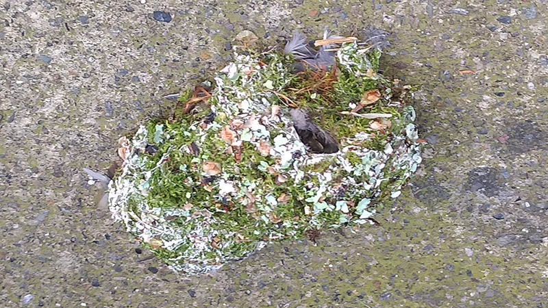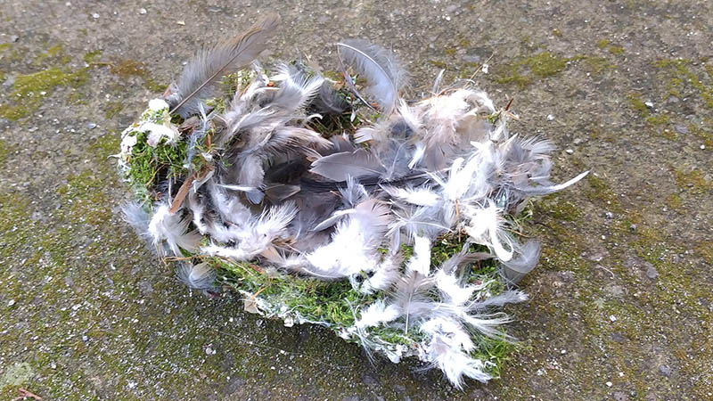 その帰途、道路の真ん中に散らばった羽と巣らしきものが有って停車。