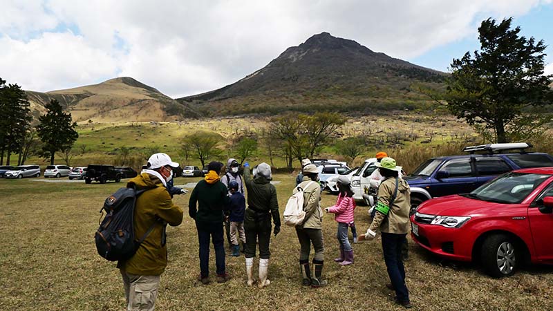 9時前に集合、先ずは杭に使う竹の切り出しを行って、杭を150本近く作成。その杭を由布岳登山道北側のサクラソウ自生地に運び、100本近く打ち込んで白い紐を皆で張り巡らせたのです。