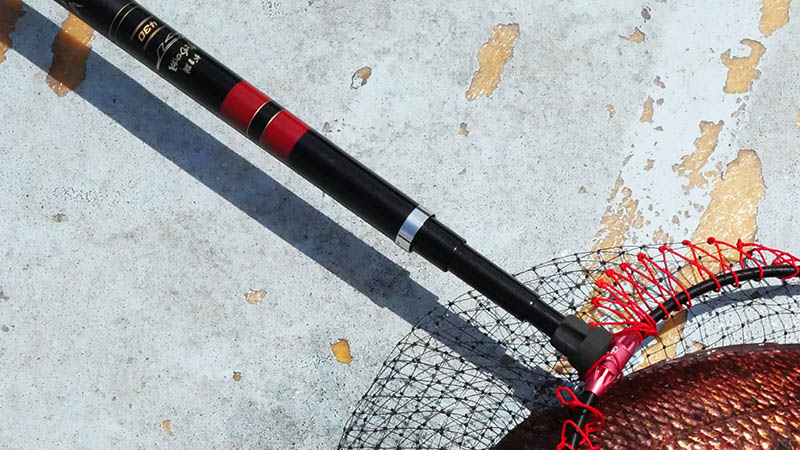過去に、このタモより浅いタモ網で86㎝のマダイを磯から掬っており、トーナメント仕様のタモの柄・タモ枠・タモ網でも80㎝超えのマダイやヒラメもOK。