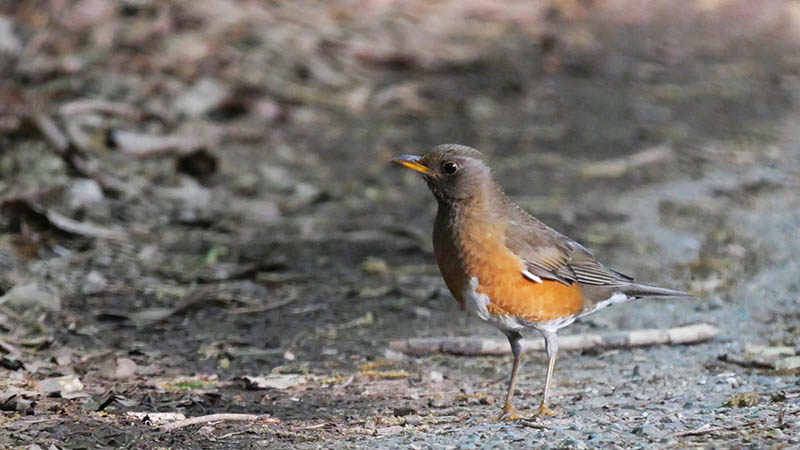 車をいつでも動かせる状態にして、行き止まりの道に停車。暫く待つと遠くの方でクロツグミの♂を確認。見えなくなって暫くすると今度は囀りや地鳴き。8時過ぎに近くの道脇に出でエサを漁り始め、最短距離は車から5mくらい。