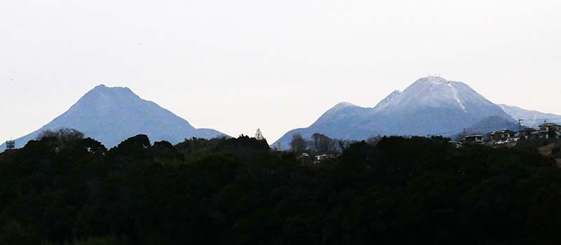 左の由布岳に雪が少なく、右の鶴見岳に雪が多い貴重な写真