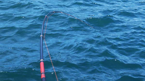 次は底にサシエが到達する寸前、ゆっくりと竿先がお辞儀したので合わせると、ぐんぐん沖側へと突っ走ります。捕れると判断し竿の曲がりを撮影しながらヤリトリ。こちらが主導権を取って最後の詰め・・と思った瞬間バチン!!