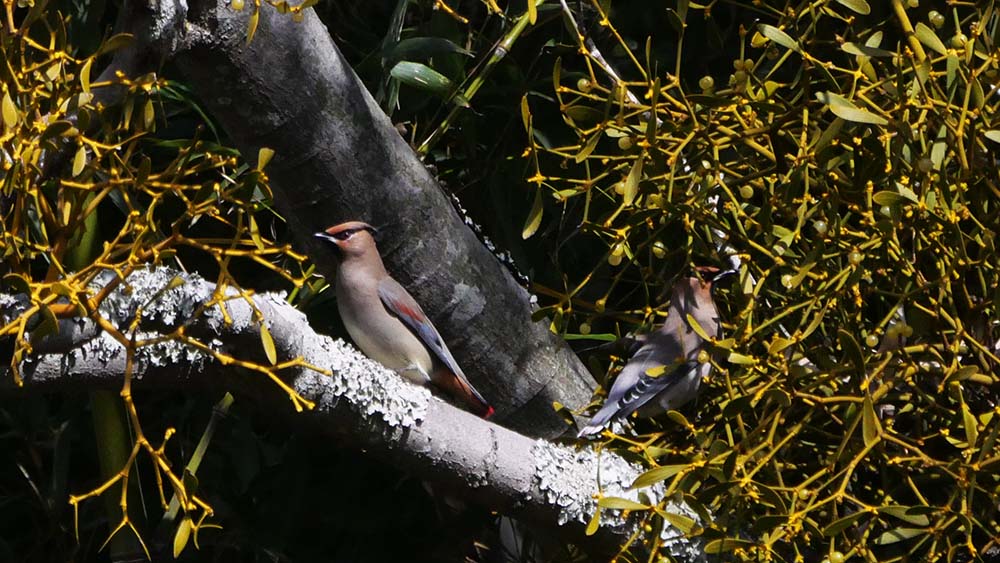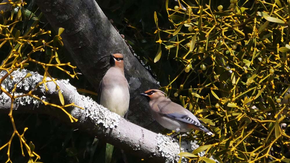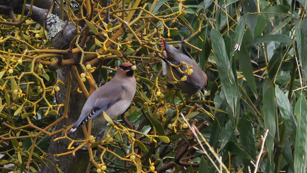二羽で仲良くヤドリギの実を啄ばんでいます