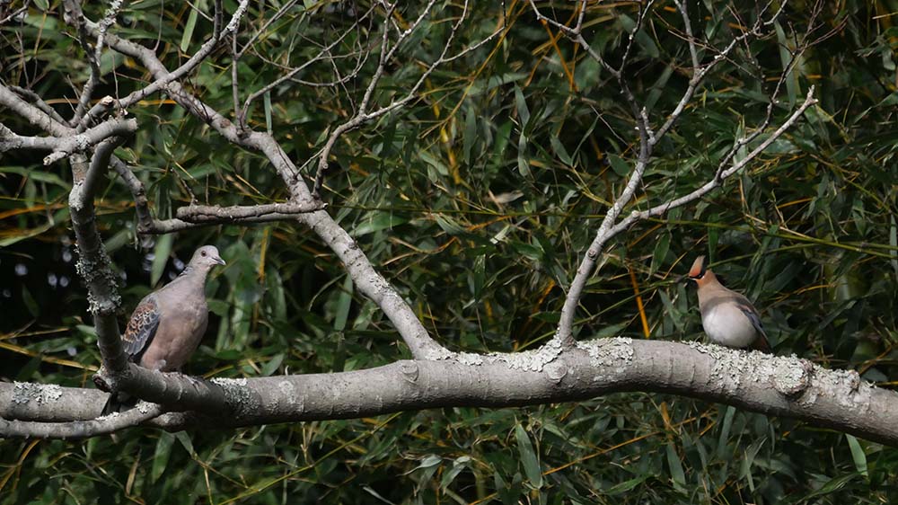 白尾ヒレンジャクがキジバトを追い払いました