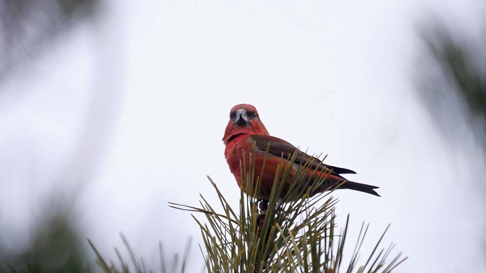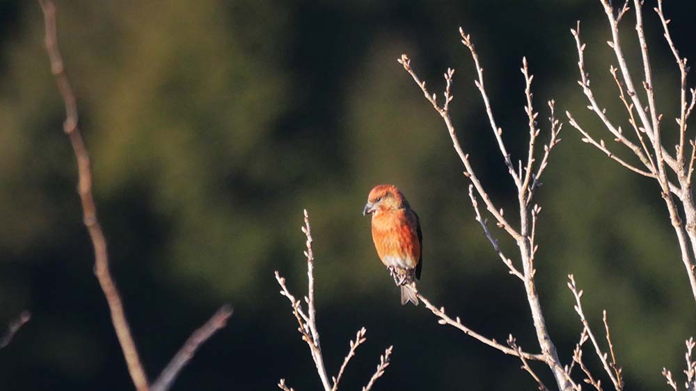 B地点ではカラ松の梢に3羽のイスカを目視。C地点では上空を20羽以上のイスカが水飲み場へと移動、続いて8羽も後を追うように上空を鳴きながら通過。