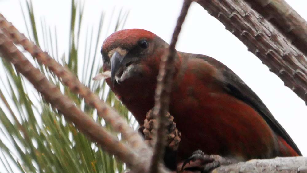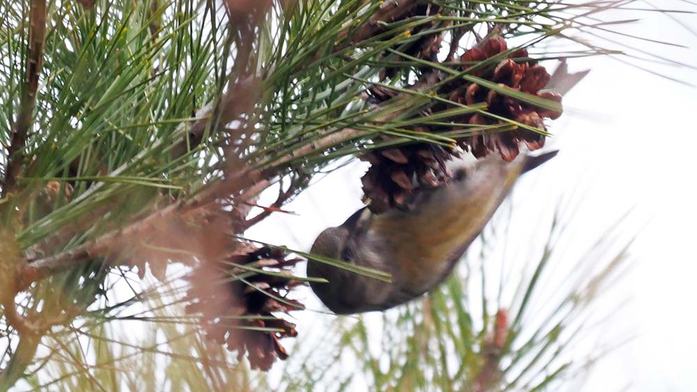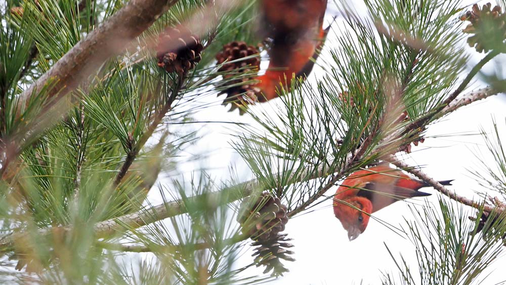 先ずはA地点、歩き始めて直ぐにパチパチ音。近くの赤松の実をイスカが啄ばんでいる。その数10羽以上、チェック中だから少しだけ写真を撮って進みます。