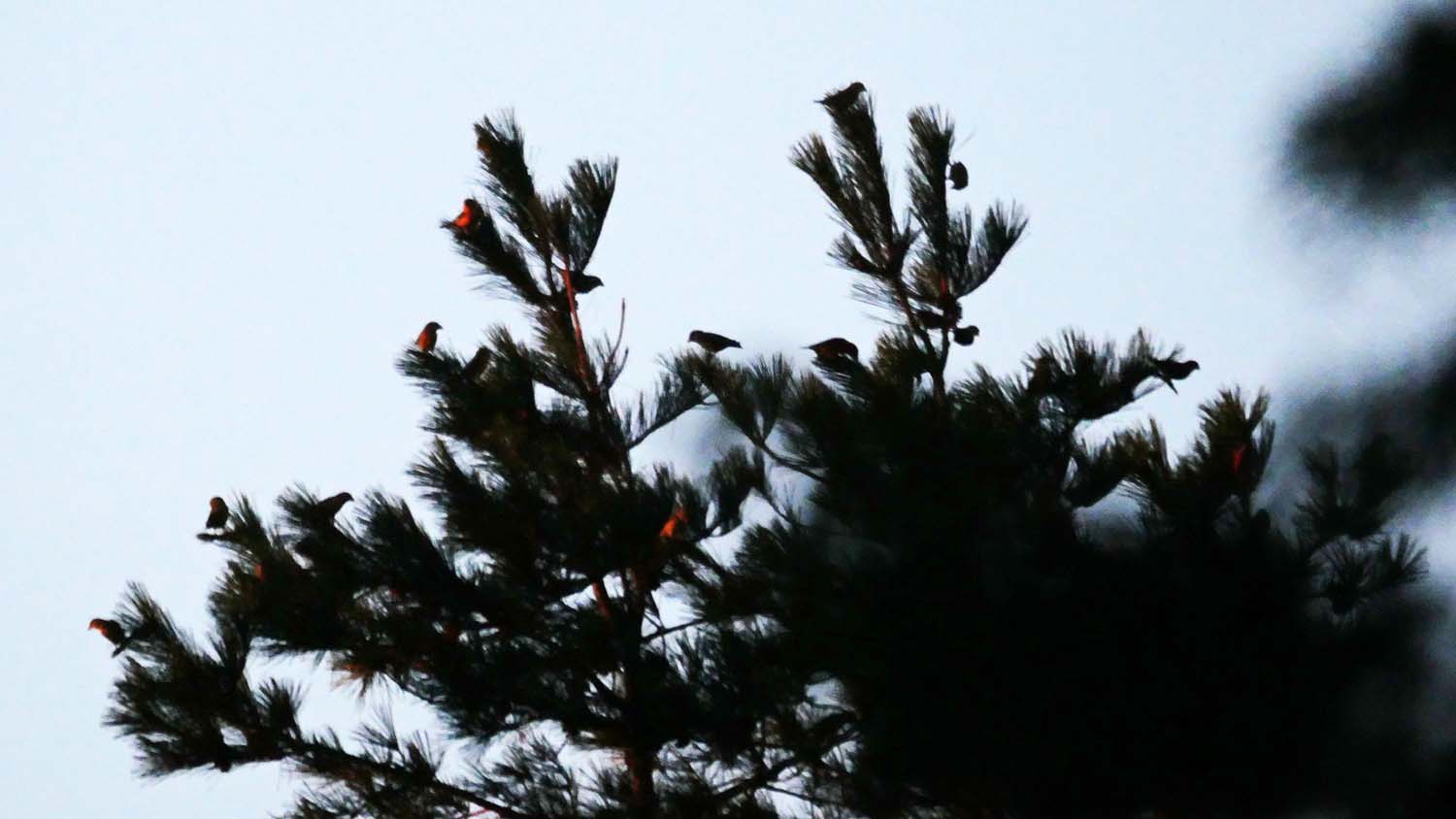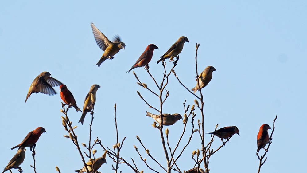 今朝は氷を割って除去後、30分で再度凍り始めた薄氷を除去した直後、イスカの群れが25羽ほど到着、その後10羽が合流、合計35羽くらいが木に止まった。